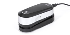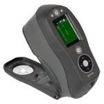 Handheld sphere spectrophotometer to measure color values on reflective surfaces like metallic packaging and foil blister packs.