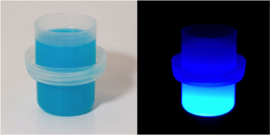 Cuando se ven bajo condiciones de iluminación normal, estas partes de plástico parecen blanco brillante, pero cuando se ven bajo luz UV, se puede ver el efecto brillante de los agentes blanqueadores ópticos que se agregaron.