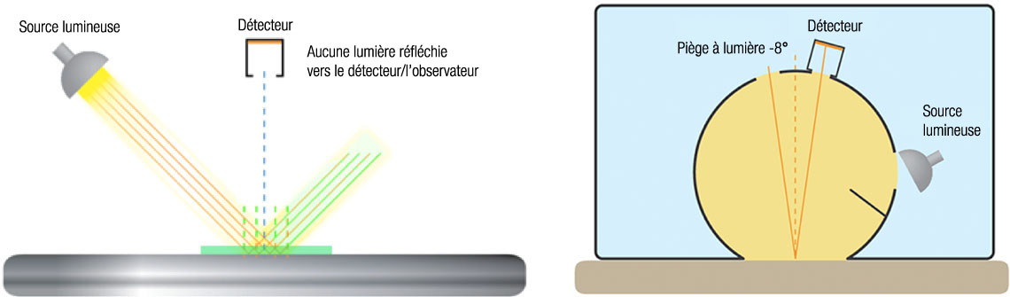 Avec un instrument à sphère : le spectrophotomètre à sphère est spécifiquement conçu pour mesurer avec fiabilité la couleur d’échantillons présentant des surfaces brillantes ou réfléchissantes. Il illumine l’échantillon de façon diffuse, puis relève la mesure à un angle de 8° par rapport à l’axe perpendiculaire. Les illustrations ci-dessous comparent le fonctionnement d’un spectrophotomètre à géométrie 0°/45° (image de gauche) avec celui d’un spectrophotomètre à sphère.