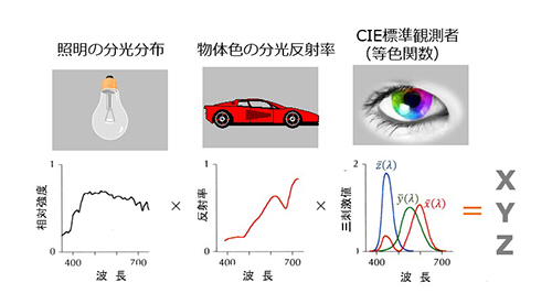 これまで、色彩値の算出に必要な3つの要素、①照明としての光、②色としての物体、③受光器としての目をそれぞれ説明してきました。今回は、これらの要素から得られた値を使用してどのように色彩値を算出するかを説明します。