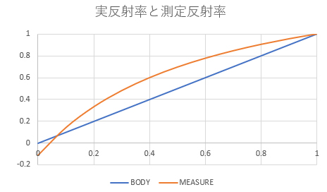 測定反射率と実反射率の関係は、インク面の場合おおむね以下のようになります。