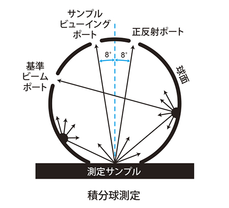 50年近くの間、調色システムの測色において主要な役割を果たしてきたのが、積分球をベースにした手段です。 ほとんどの積分球測色計は、”正反射光”を含んだ測定をおこなうことができます。球面にある小さなトラップドアを開くことによって、”正反射光”を測定対象から除外することもできます。 多くの場合、調色用のデータベースでは、この正反射光を測定対象の一部とした方が、より精度が高いとされています。 織物や表面がザラついたり不規則であるもの、また表面が鏡のようなサンプルの場合、この測定方法が一番適しているといえます。 テキスタイルの製造メーカーや屋根ふきタイルの製造メーカー、防音素材の製造メーカーでは、ほぼ全ての会社において基幹ツールとして積分球分光測色計が採用されています。