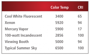 色評価のために顧客に照明光源を指定してもらうと、代わりに光源の相関色温度を教えてくれることがあります。色温度の低い光源は一般に赤と黄色の波長の割合が高く、色温度の高い光源は一般に青色の割合が高くなります。しかし、5000Kと測定された昼間の太陽光に照らされた物体の色が、5000Kの人工光源に照らされるとは大きく異なって見えることがあります。
