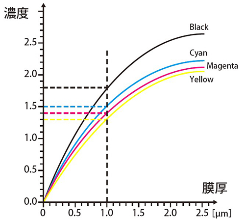 つまり、濃度∝インク膜厚∝色材量という関係が成立するわけです。