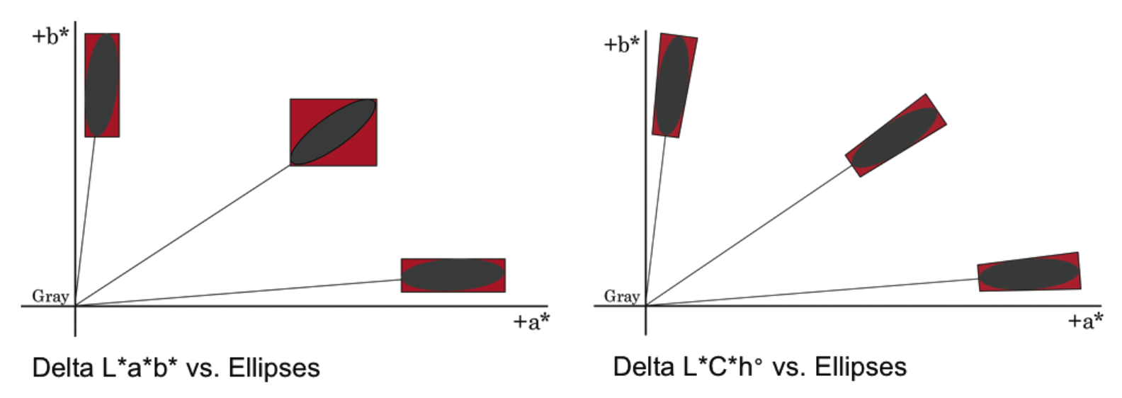 The image below compares tolerancing in L*a*b* and L*C*h°. The black oval shows the range of colors that visually appear within tolerance, while the red rectangle around the perception ellipse will be recorded as “in tolerance” by color measurement software.