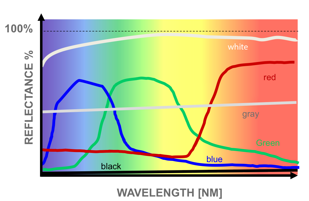 Azul, verde e vermelho estão no pico de suas respectivas cores, demonstrações perfeitas de como as curvas de reflexão se alinham com o espectro visual. Pico vermelho alto = alta concentração de luz vermelha.