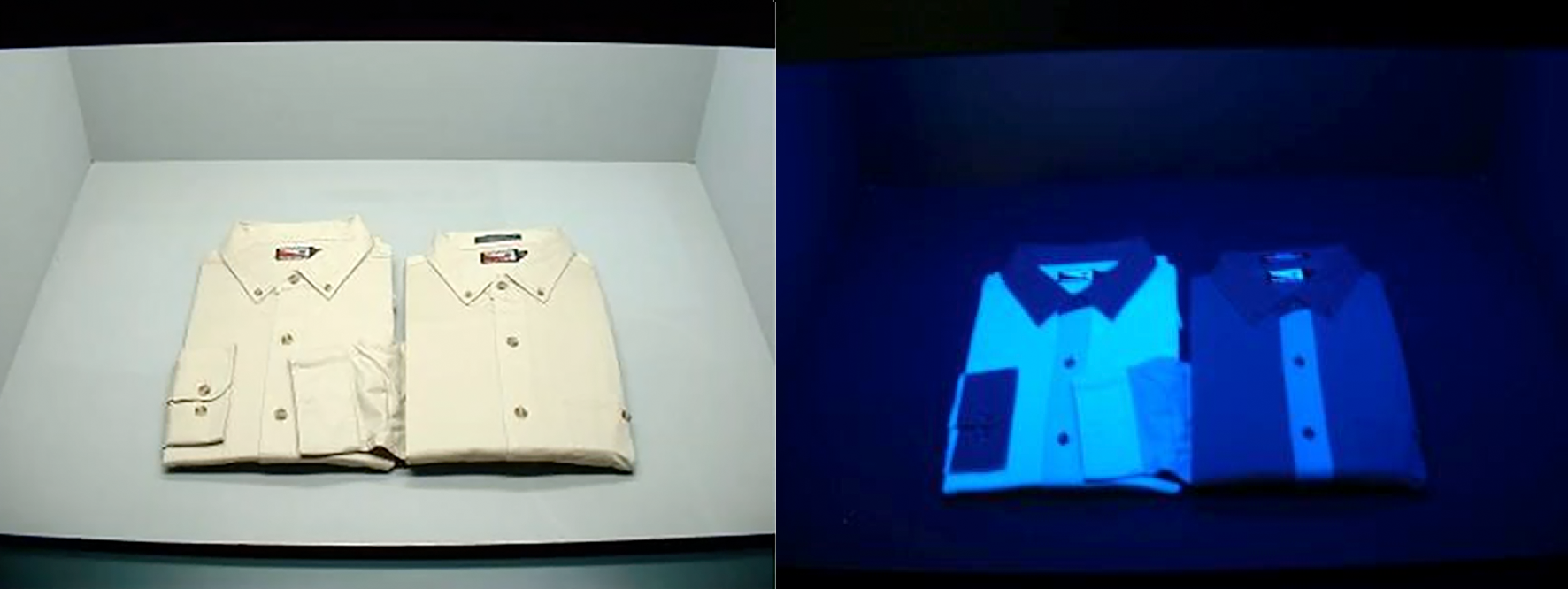 Os OBAs absorvem luz da região ultravioleta do espectro eletromagnético que não podemos ver e reemitem essa luz na região azul, onde podemos vê-la. Nossos olhos perceberão esse branco como mais brilhante do que o branco que não contém agentes clareadores ópticos.