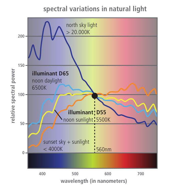 A desvantagem é que a luz solar nem sempre está disponível e suas proporções de cores mudam constantemente. A luz do dia do meio-dia é diferente no verão e no inverno, em um dia nublado versus ensolarado e até mesmo entre localizações geográficas. A luz ao nascer do sol em um dia claro é carregada com comprimentos de onda amarelo e vermelho, mas a curva se desloca com mais intensidade para o lado azul do espectro ao meio-dia. A luz do dia em Paris é totalmente diferente da em Nova York no mesmo dia e hora, mesmo que as condições climáticas sejam idênticas.
