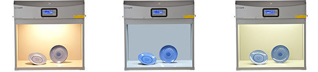 ▴ PICTURED: These plates were photographed inside X‑Rite's SpectraLight QC under three different light sources. See how their appearance changes?
