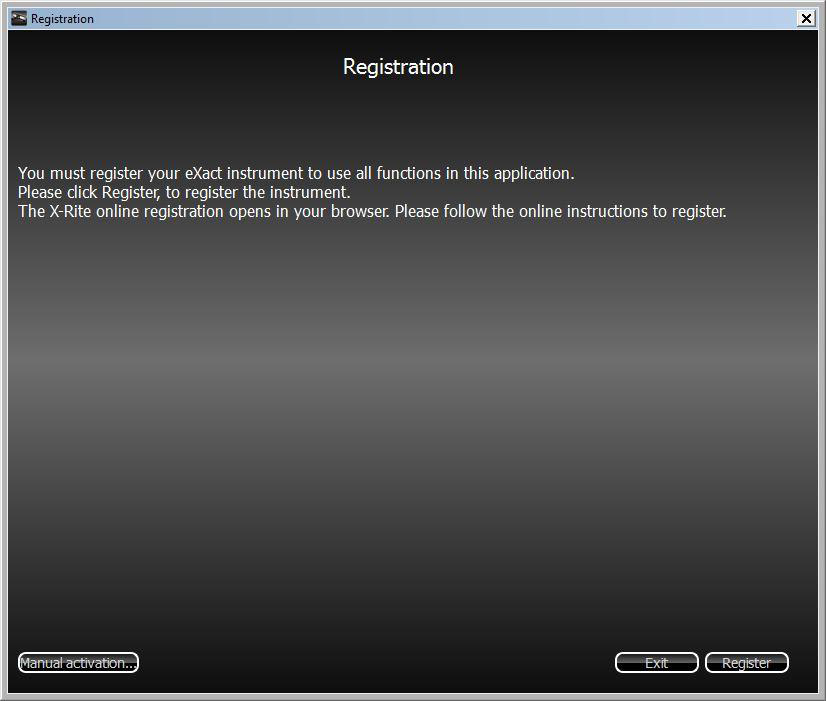 If the customer has an internet connection, they simply click Register, and their instrument will be registered after logging into their "My X-Rite" account. If they do not have an internet connection, clicking Manual activation… will cause the following screen to appear.